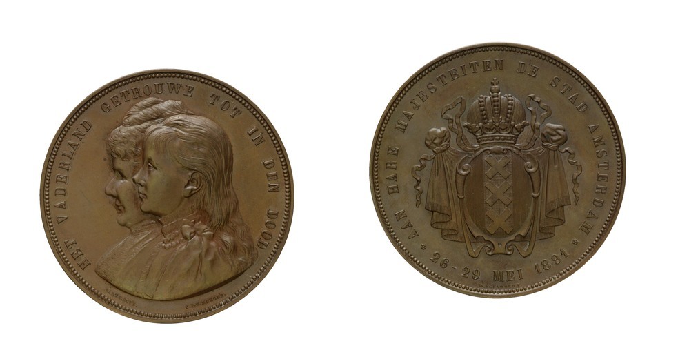 omschrift keerzijde: AAN HARE MAJESTEITEN / DE STAD AMSTERDAM * 26-29 MEI 1891 *