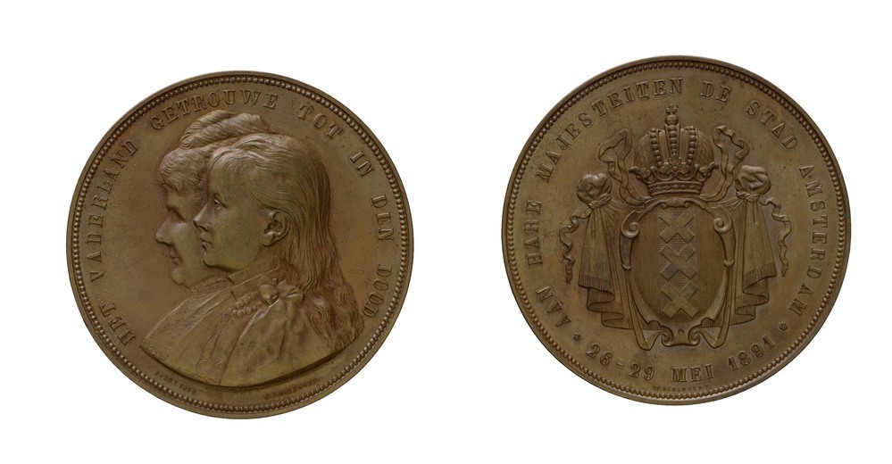 omschrift keerzijde: AAN HARE MAJESTEITEN / DE STAD AMSTERDAM * 26-29 MEI 1891 *