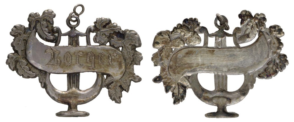 éénzijdige penning ajour bewerkt draagteken als lier, aan weerszijde versierd met druivenbladen. Over de lier een lint met een gegraveerde inscriptie. Aan de bovenzijde een oog met ring.- Trefwoorden