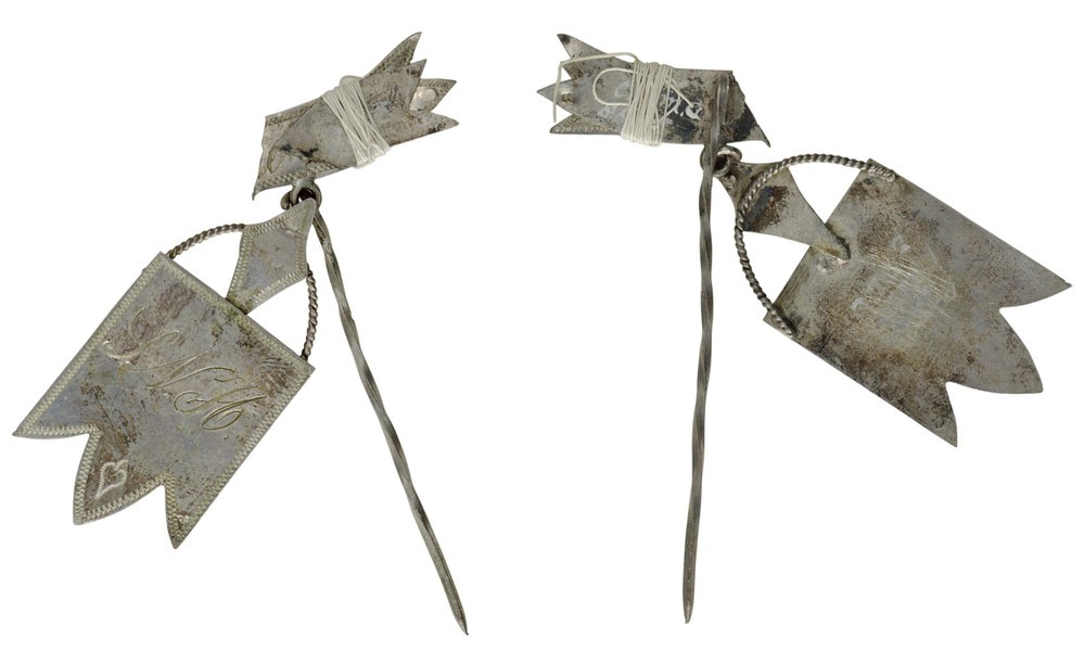 éénzijdig uitgezaagd draagteken in de vorm van een vaandel met opschrift, beneden ingesneden met 3 punten. Afgewerkt met een smalle geïncrusteerde rand met benedenaan een hartje. Aan het vaandel een gedraaid zilveren koordje waarop een ruitvormig schildje met bovenaan een oog, waaraan een speld en een zilveren lintje met opschrift.