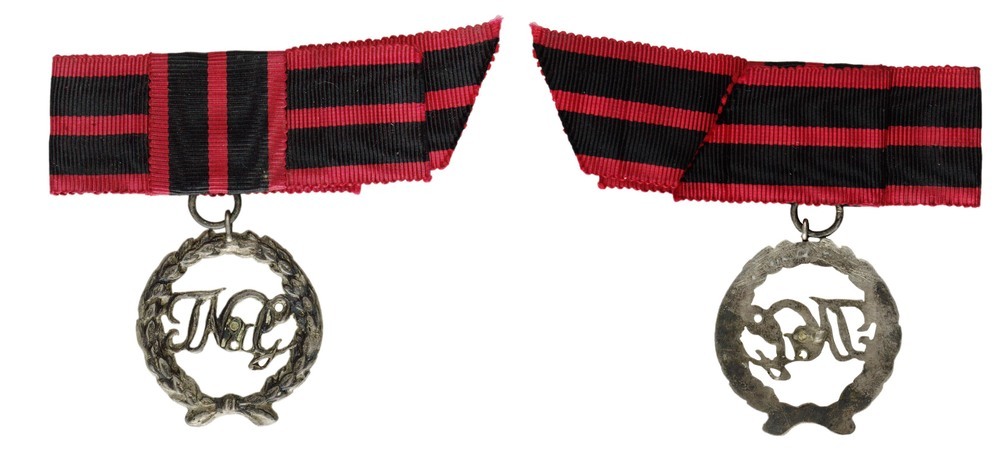 éénzijdig ajour bewerkt draagteken in de vorm van een krans uit lauwertakken. Binnen de krans de opengewerkte letters T N & G. Bovenaan de krans een oog en ring met een zwart-rood gestreept stoffen lint.