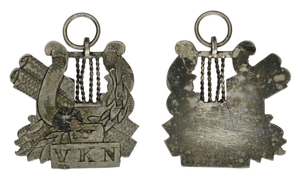 éénzijdig opengewerkt draagteken in de vorm van een lier met snaren, muziekbladen en een lauwerkrans. In de voet van de lier staan de letters VKN, bovenaan een oog met ring.- Trefwoorden