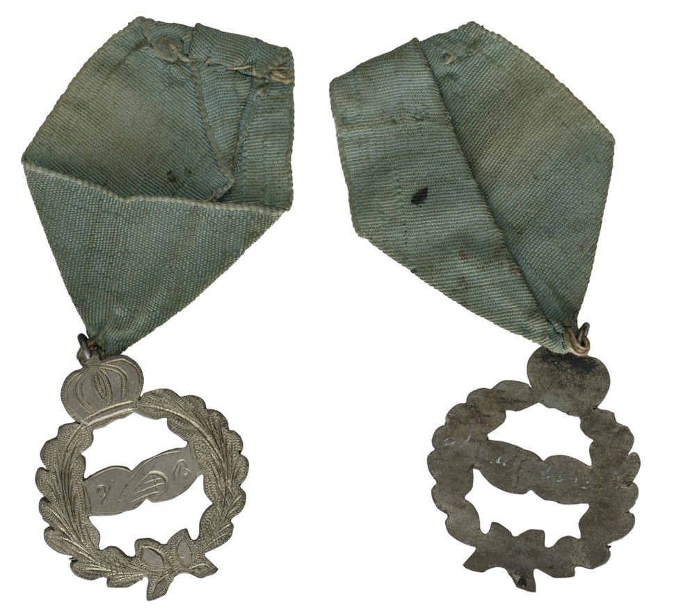 éénzijdig opengewerkt en gegraveerd draagteken in de vorm van een gestrikte lauwerkrans, waarboven een kroon met oog en ring. Binnen de krans twee ineengeslagen handen. Op de linkerhand een V en op de rechterhabd een B gegraveerd. Het insigne hangt aan een lichtblauw lint.