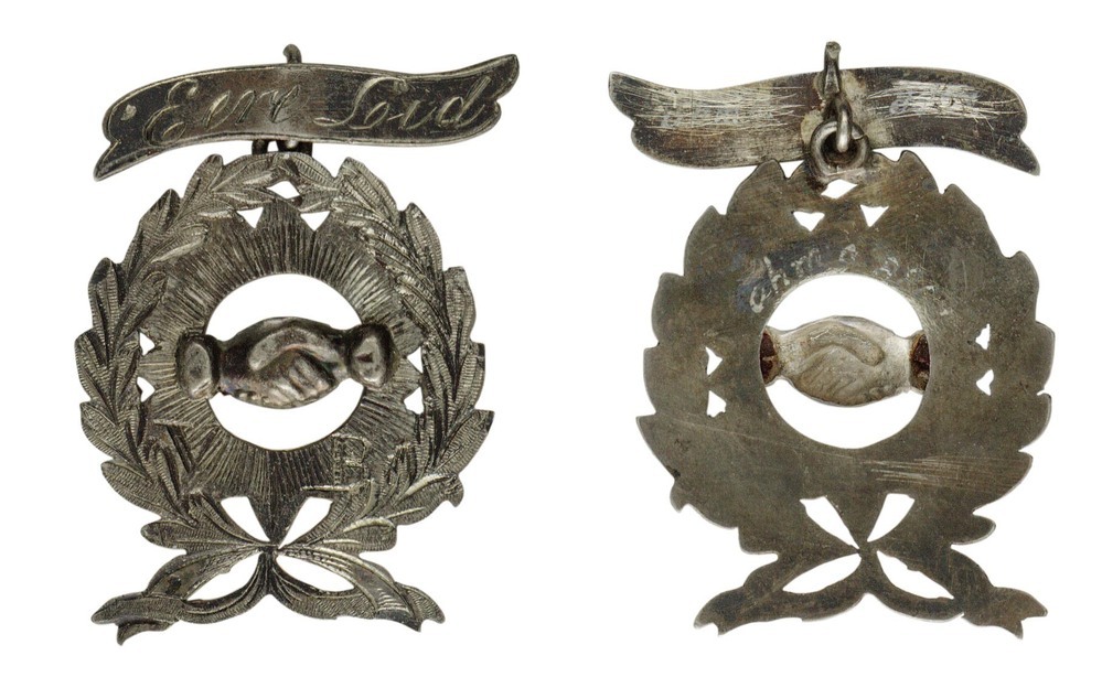 éénzijdig opengewerkt en gegraveerd draagteken met twee ineengeslagen handen in een stralende ster, omgeven door een lauwerkrans. Beneden samengebonden door een lint. Op de linkerhand de letter V en op de rechterhand de letter B gegraveerd. De krans hangt aan een zilveren lintje waarop een opschrift gegraveerd.