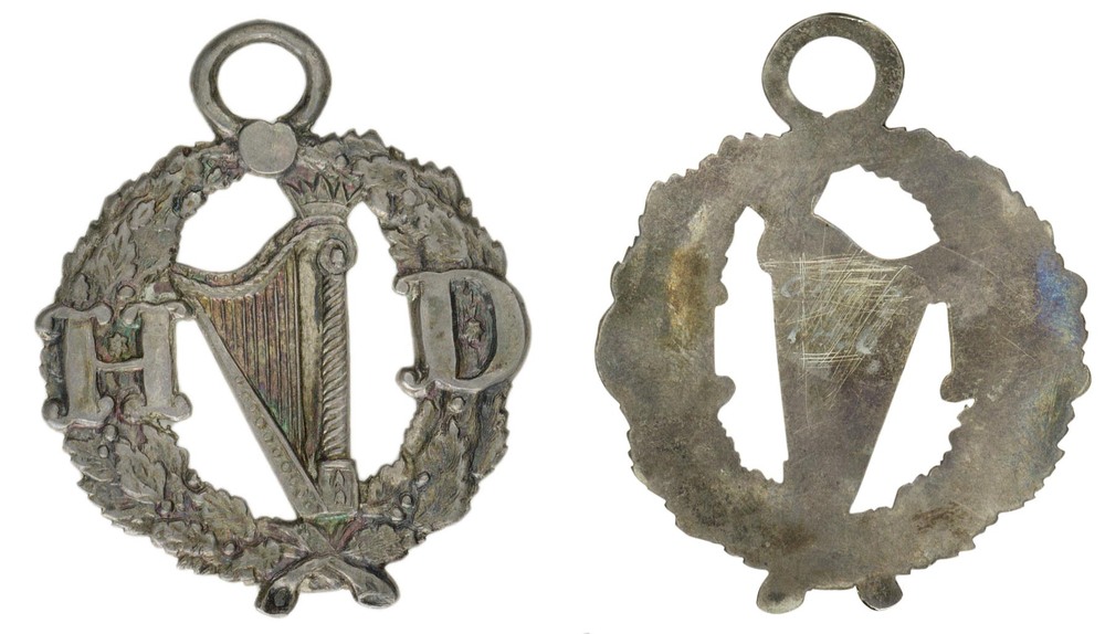 éénzijdig opengewerkt draagteken in de vorm van een harp, omgeven door een gestrikte eikenbladkrans waarop in reliëf twee letters: Links een H en rechts een D. Bovenaan een oog.- Trefwoorden