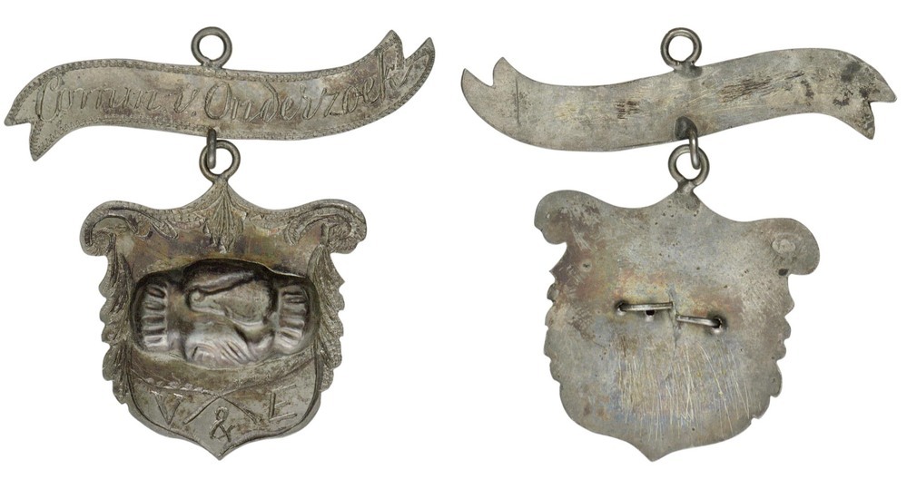 éénzijdig opengewerkt draagteken in de vorm van een schild, omgeven door voluten. In reliëf twee op elkaar gelegde handen die met twee pinnen door het schild zijn aangebracht. Onderaan het schild een opschrift; bovenaan een oog, waaraan een ander oog met zilveren lint met een opschrift Daar weer bovenaan een oog.