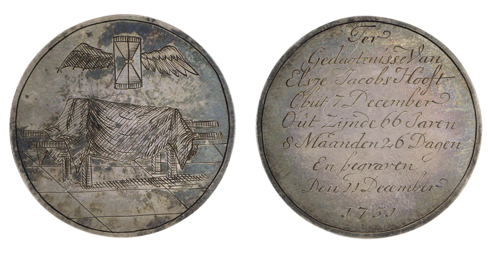 opschrift keerzijde: Ter / Gedagtenisse Van / Elsje Jacobse Hooft / Obút 7 December / Oút Zijnde 66 Jaren / 8 Maanden 26 Dagen / En begraven / Den 11 December / 1751