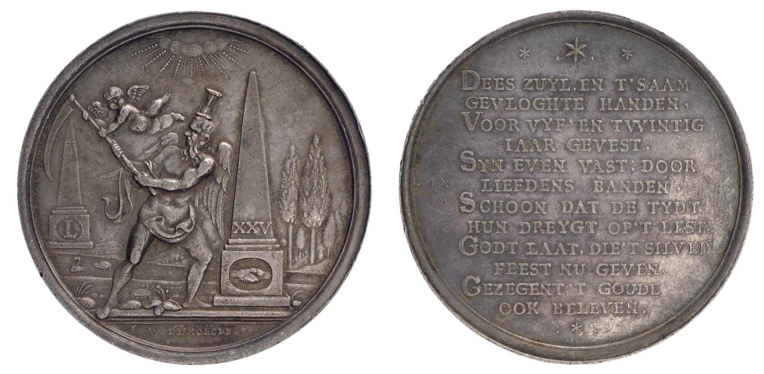 Voorzijde: de Tijd, voorgesteld als oude, gevleugelde, bebaarde man, naakt, met een doek om zijn rechterarm en lenden geslagen en met een zandloper op het hoofd, probeert met zijn zeis een obelisk rechts met daarop het getal vijfentwintig in Romeinse cijfers te vernietigen, maar wordt daarvan weerhouden door een gevleugelde Amor die boven hem zweeft en de zeis vastgrijpt. Op de basis van de oblisk een cartouche met daarin twee ineengestrengelde handen. De rechtervoet van De Tijd bevindt zich op de afsnede. Tijd en rechterobelisk bevinden zich op een ondergrond met zand, stenen en planten. Daarachter een rivier met daarin twee zwanen; de rechterzwaan duikt naar voedsel. Rechts van de obelisk acht cypressen. Links van de Tijd aan de overkant van het water een tweede obelisk met het getal vijftig in Romeinse cijfers. Midden boven het woord "Jahweh" in Hebreeuwse tekens [onleesbaar] omkranst door wolken van waaruit hemelse stralen. Signatuur van de maker onder afsnede.
