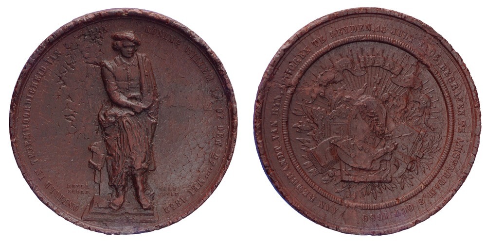 omschrift keerzijde: AAN REMBRANDT VAN RYN, GEBOREN TE LEYDEN, 15 JULY 1606, BEGRAVEN TE AMSTERDAM, 8 OCT 1669.