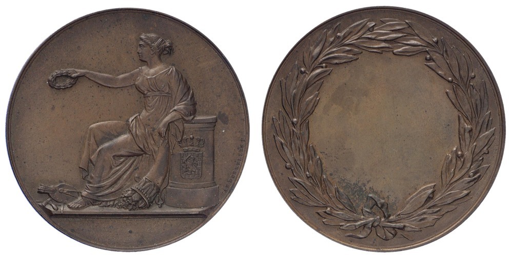 voorzijde: allegorie van de kunst in de vorm van een zittende dame naar links in Grieks gewaad, met de linkerarm leunend op een altaar met het gekroonde wapen van Nederland en in haar linkerhand een hoorn des overvloeds, die naar beneden afloopt. Haar linkerarm steekt gestrekt naar voren met in haar hand een olijfkrans. Aan haar voeten links een passer, een palet, beeldhouwershamer, graveerstift en penselen. Tegen de rand van de penning achter het altaar een signatuur. In de afsnede een leeg veld.