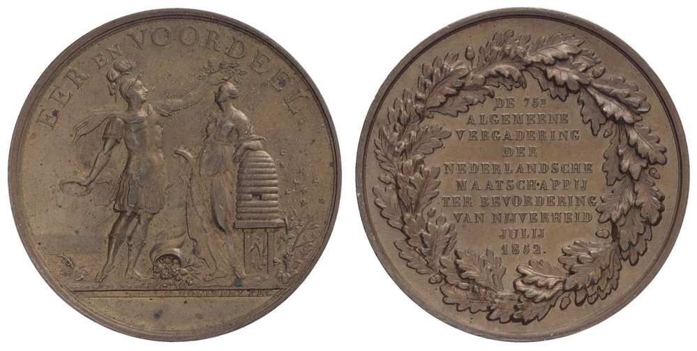 opschrift keerzijde midden: DE 75E / ALGEMEENE / VERGADERING / DER / NEDERLANDSCHE / MAATSCHAPPIJ / TER BEVORDERING / VAN NIJVERHEID / JULIJ / 1852.