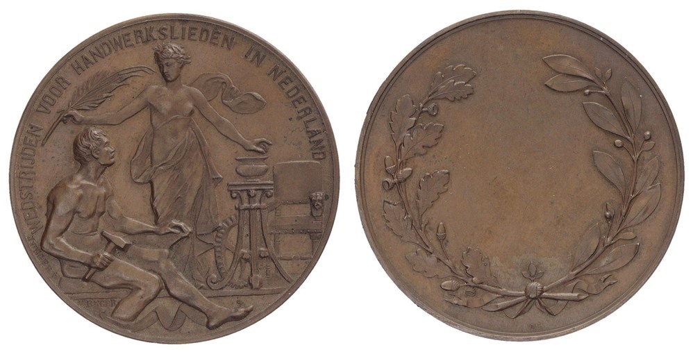 voorzijde: links een naakte werkman zittend met een hamer in de rechterhand en met de linkerarm rustend op een aambeeld, rechts een stoel, vaas en rad, in het midden een halfnaakte vrouwenfiguur die met de rechterhand de werkman een palmtak (teken van eerbetoon) aanreikt. In de afsnede een signatuur.