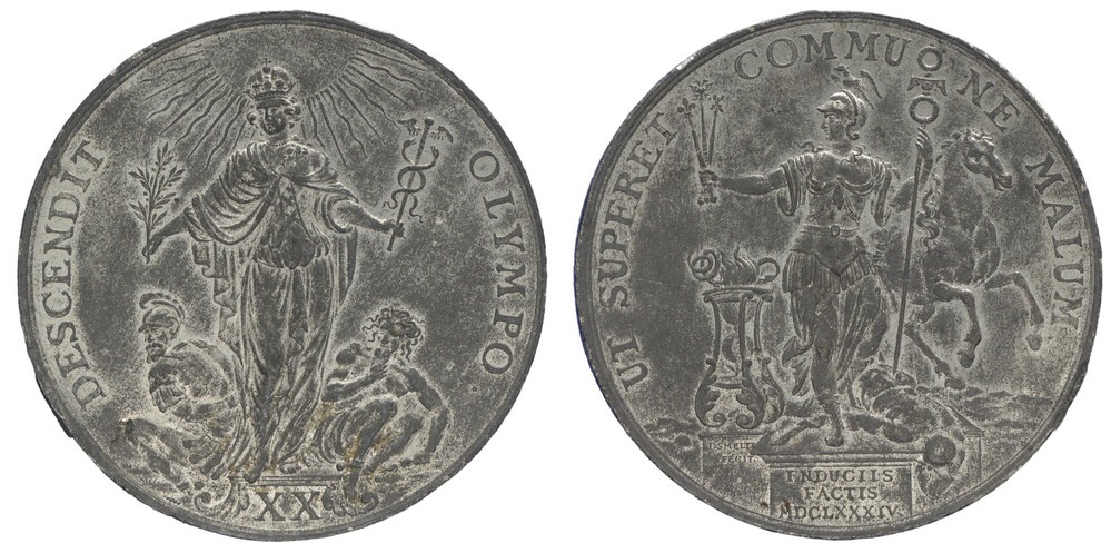 voorzijde: allegorie van Pallas, godin van wijsheid, de wetenschap en de schone kunsten, welke de oorlogsgod Mars vertrapt, staat tussen een ongezadeld paard en een altaar waarop een slang wordt verbrand. In haar linkerhand houdt zij een staf waar bovenop een Romeins legerteken, in de andere hand houdt zij een drietal scepters van de Keizer en de koningen van Frankrijk en Spanje. Onder het altaar een opschrift en onder het voetstuk een opschrift. Langs de rand een omschrift.