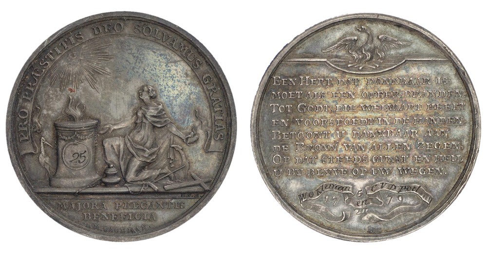 opschrift keerzijde: Een Hert dat dankbaar is / moet als een offer branden. / Tot Godt, die welvaart heeft / en voorspoedt in de handen. / Betoont u dankbaar aan / de Bronn van allen zegen, / Op dat steeds gunst en heil / u by blyve op uw wegen.