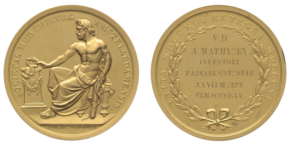 voorzijde: in een omschrift de persoon aesculaap gezetennaar links gewend. In zijn linkerhand een staf met kronkelende slang; zijn rechterhand houdt een lauwerkrans boven een altaar waarop een geschrift, Het altaar is versierd met een guirlande. In de afsnede een signatuur.