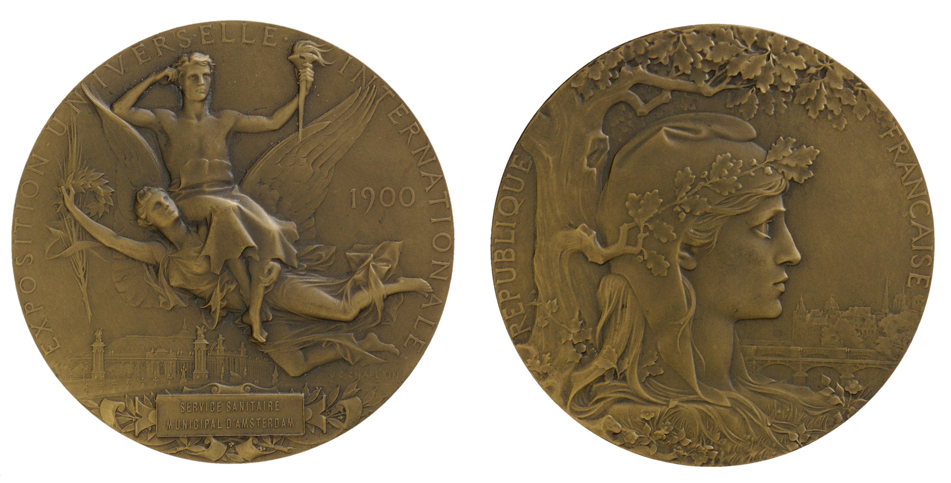 Beeld voorzijde: een gevleugelde vrouw op wier rug een man is gezeten met een brandende toorts in de linkerhand. Op de achtergrond de expositiehallen. Naast de vrouw het jaartal 1900.