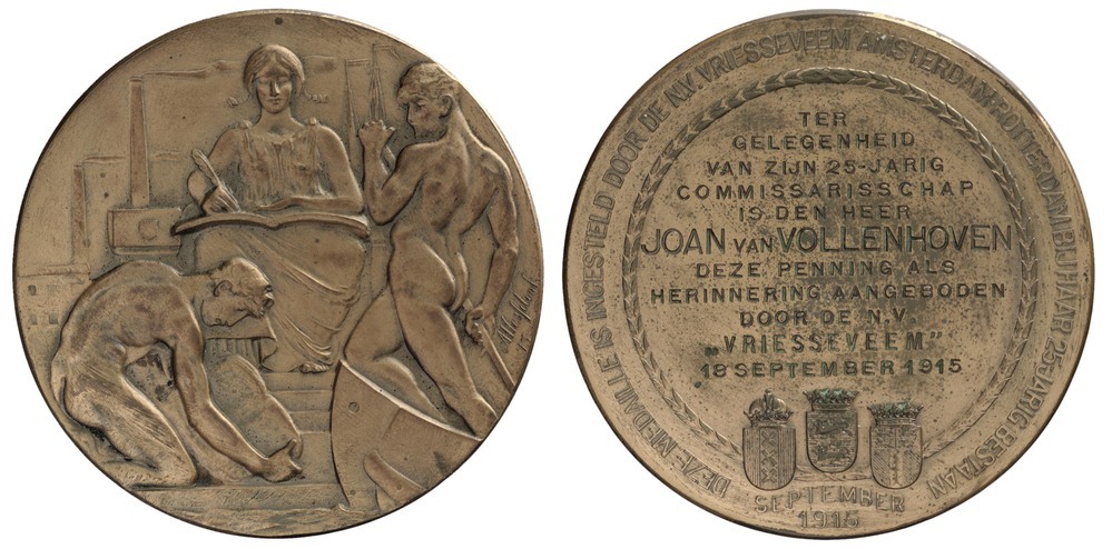 opschrift keerzijde: TER / GELEGENHEID / VAN ZIJN 25-JARIG / COMMISSARISSCHAP / IS DEN HEER / JOAN VAN VOLLENHOVEN / DEZE PENNING ALS / HERINNERING AANGEBODEN / DOOR DE N.V. / "VRIESSEVEEM" / 18 SEPTEMBER 1915