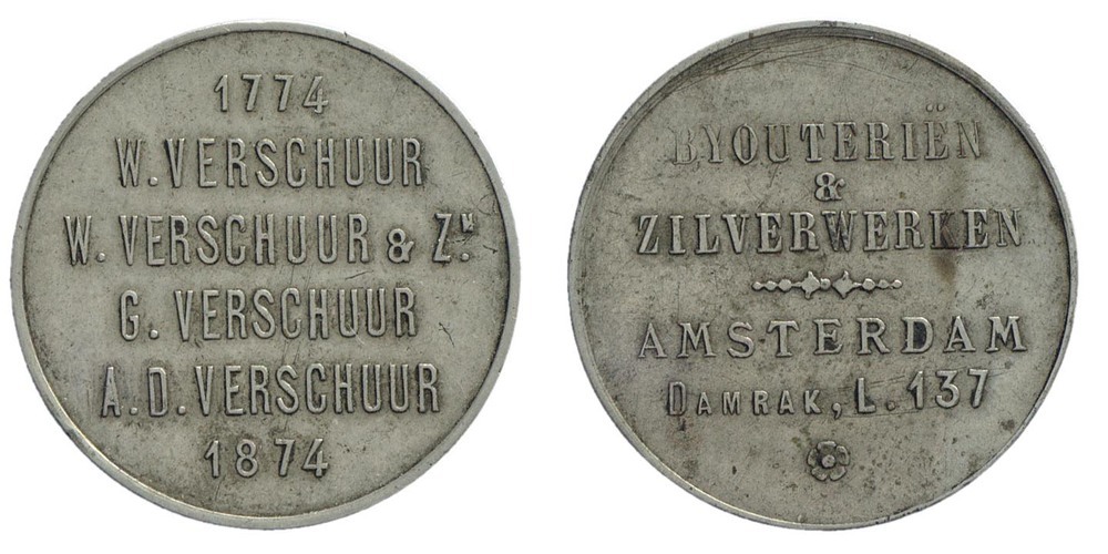 100 jarig bestaan van de firma Verschuur, Byouterien & Zilverwerken, Damrak L. 137, 1874 zilver hoogte: 2.8 cm; breedte: 2.8 cm; diepte: 0.1 cm; gewicht: 6.22 gr; opschrift voorzijde: 1774 / W. VERSCHUUR / W. VERSCHUUR & ZN / G. VERSCHUUR / A.D. VERSCHUUR / 1874