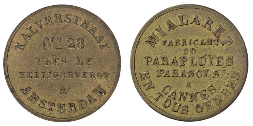 Mialaret, fabrikant van paraplu's en dergelijke, Kalverstraat 28, 1875 - 1925 koper, metaal hoogte: 2.4 cm; breedte: 2.4 cm; diepte: 0.1 cm; gewicht: 3.77 gr; opschrift voorzijde: KALVERSTRAAT N°28 / PRES LE / HELLIGUEVERGT / A / AMSTERDAM