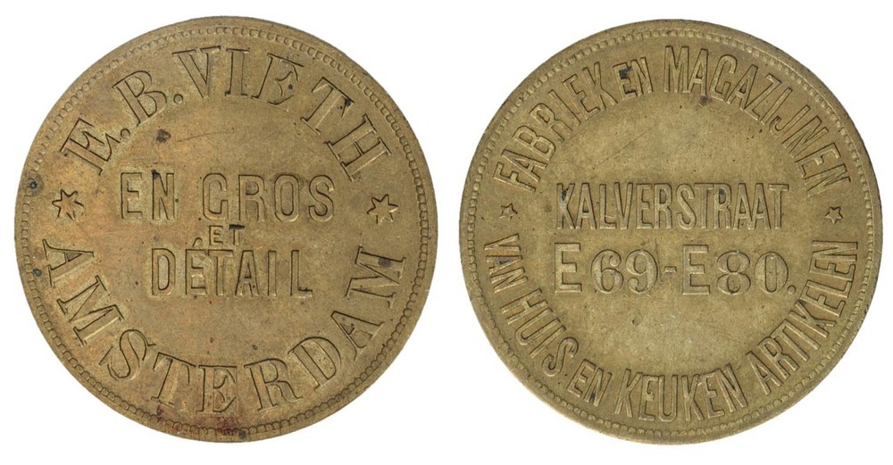 E.B. Vieth, grossier en detailhandelaar, Kalverstraat E69-E80, 1850 - 1900 koper hoogte: 3.0 cm; breedte: 3.0 cm; diepte: 0.1 cm; gewicht: 3.53 gr; omschrift voorzijde: E.B.VIETH * AMSTERDAM *