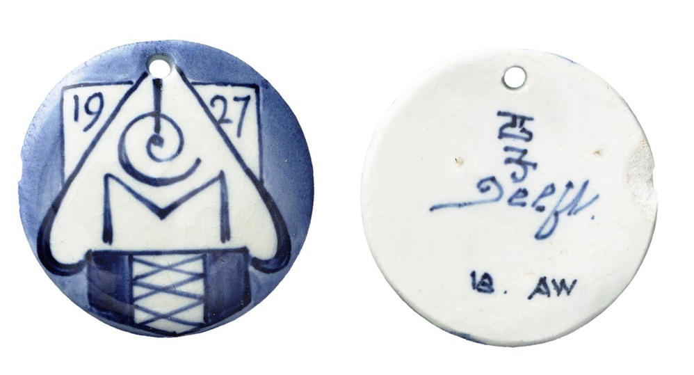 voorzijde: donkerblauw ornament op wit en lichtblauw fond met de initialen ICM en het jaartal 1927. bovenin een rond gat.