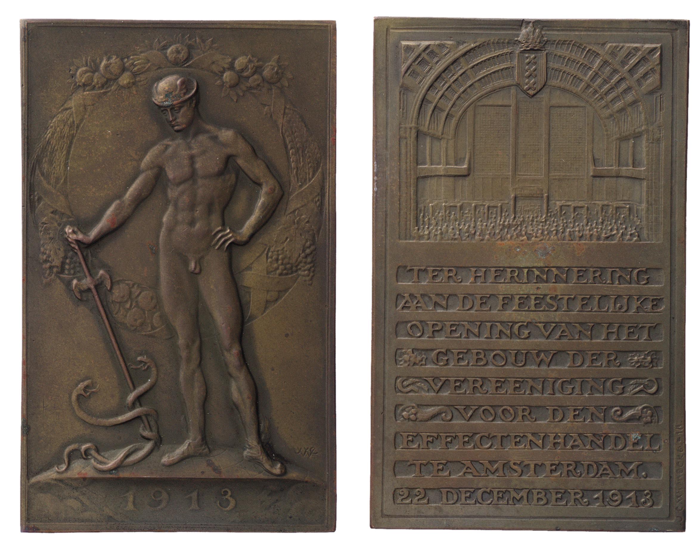 opschrift keerzijde in de afsnede: TER HERINNERING / AAN DE FEESTELIJKE / OPENING VAN HET / GEBOUW DER / VEREENIGING / VOOR DEN / EFFECTENHANDEL / TE AMSTERDAM. / 22 DECEMBER 1913