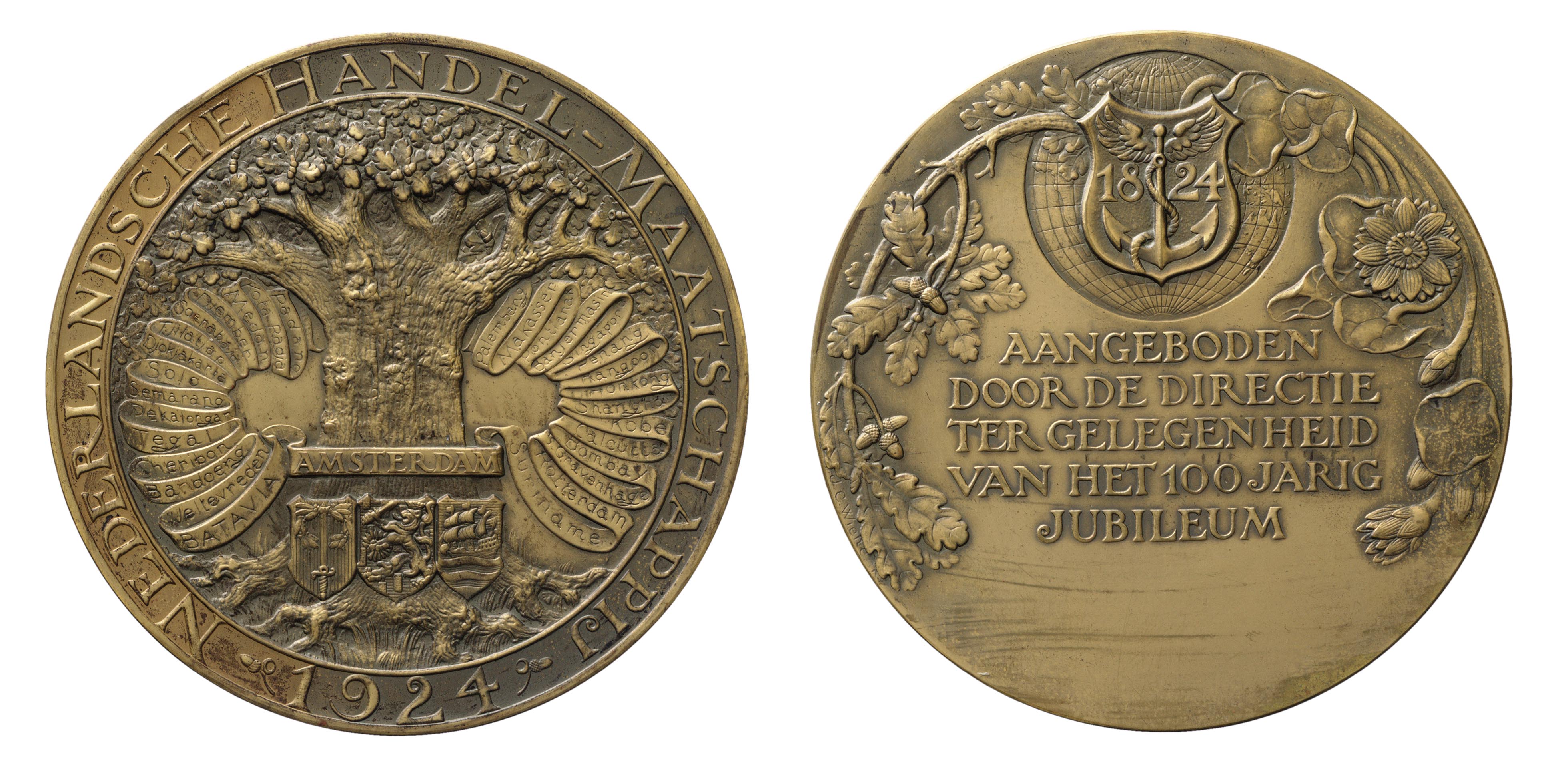 keerzijde: het wapen van de maatschappij met anker en jaartal geprojecteerd op een aardbol. Links ontspruit een eikentak en rechts een bloeiende lotustak. Onder de aardbol een opschrift.