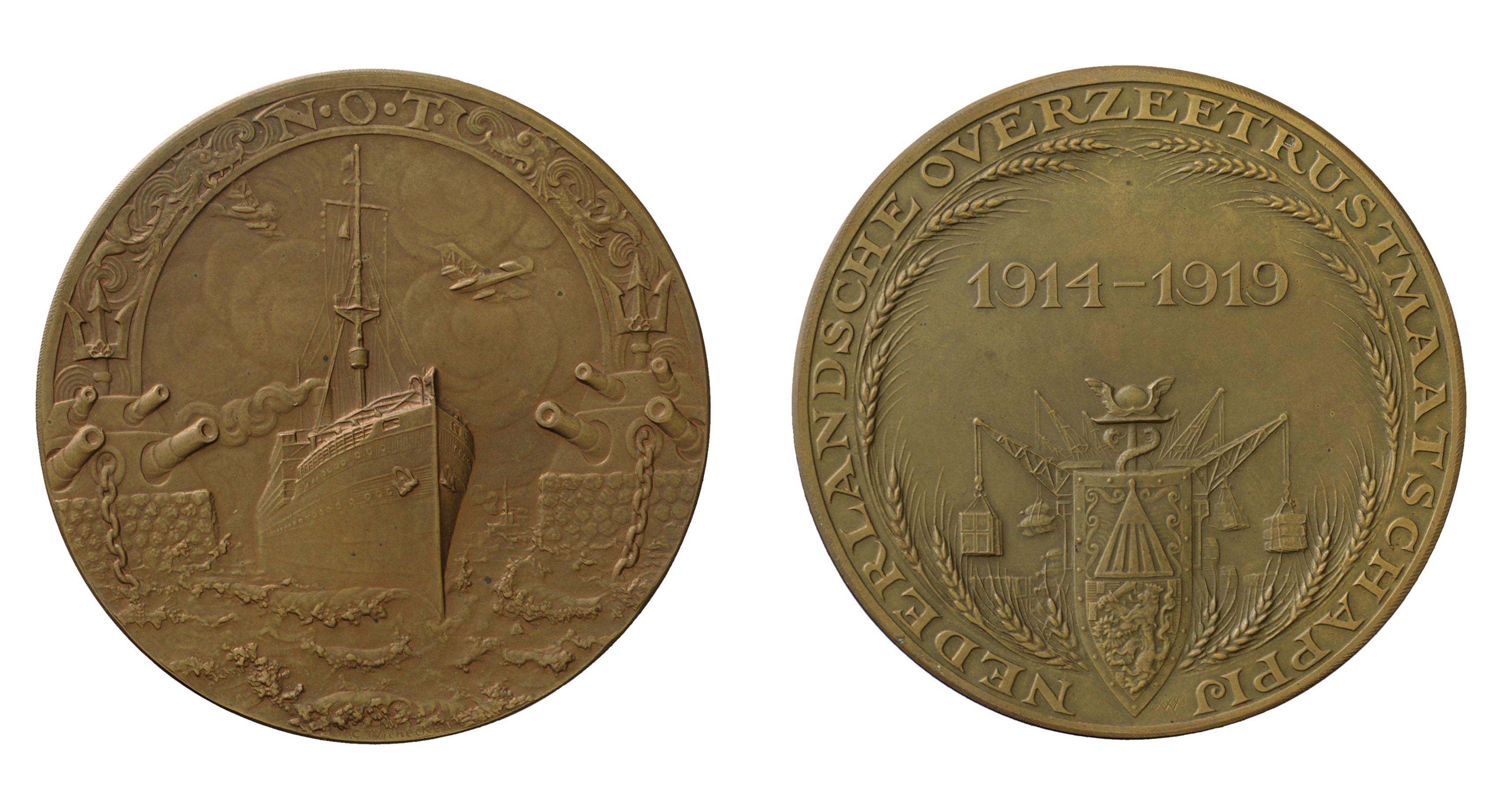 keerzijde: in een omschrift een rand van korenaren. in het veld twee jaartallen. Onderin het veld een wapenschild van Nederland, waarboven het kenteken van het N.O.T. (Nederlandsche Overzee Trustmaatschappij). Daarboven een Mercuriusstaf. Rond het wapen van Nederland kranen met overslag van balen en andere goederen. Geheel onderin een monogram.