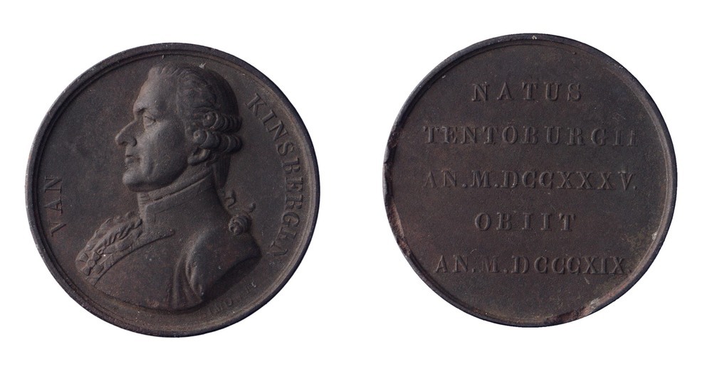 Overlijden van J.H. van Kinsbergen, bevelhebber in de slag bij de Doggersbank, te Apeldoorn (1819), 1819 brons hoogte: 4.6 cm; breedte: 4.6 cm; diepte: 0.7 cm; gewicht: 44.60 gr; signatuur voorzijde: Simon f.