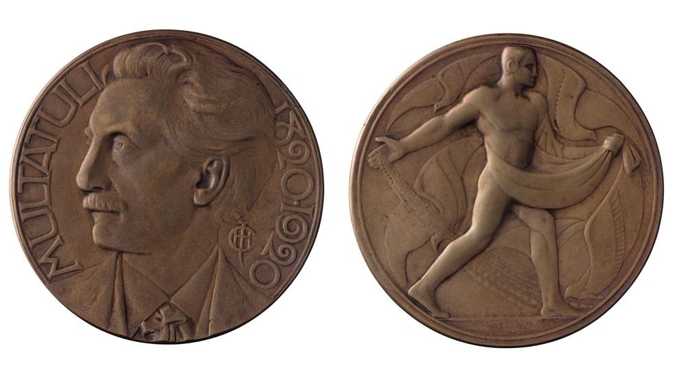 voorzijde: in een omschrift het naar links gewend borstbeeld van Multatuli. Rechts van de hals een monogram.
