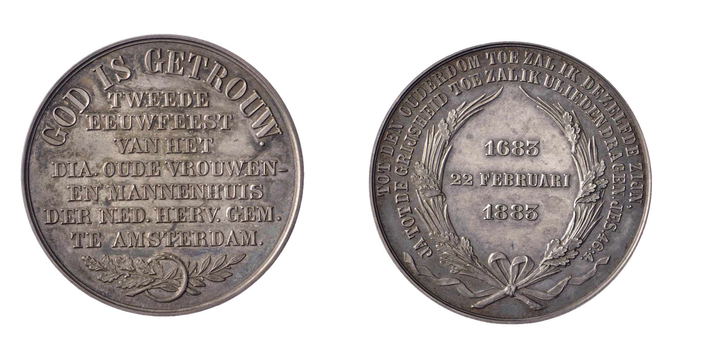 opschrift voorzijde: TWEEDE / EEUWFEEST / VAN HET / DIA. OUDEVROUWEN- / EN MANNENHUIS / DER NED. HERV. GEM. / TE AMSTERDAM.