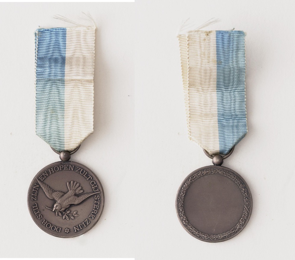 keerzijde: een leeg veld, omgeven door een eikenloof- lauwerkrans, drie maal met een lint gekruist. Bovenaan een knop met gat en ring, waaraan een ribslint, gedeeld lichtblauw en wit.