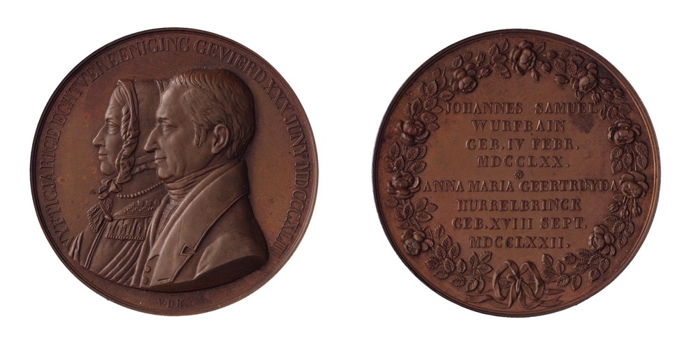 omschrift voorzijde: VYFTIGJARIGE ECHTVEREENIGING GEVIERD XXX JUNY MDCCCXLIII