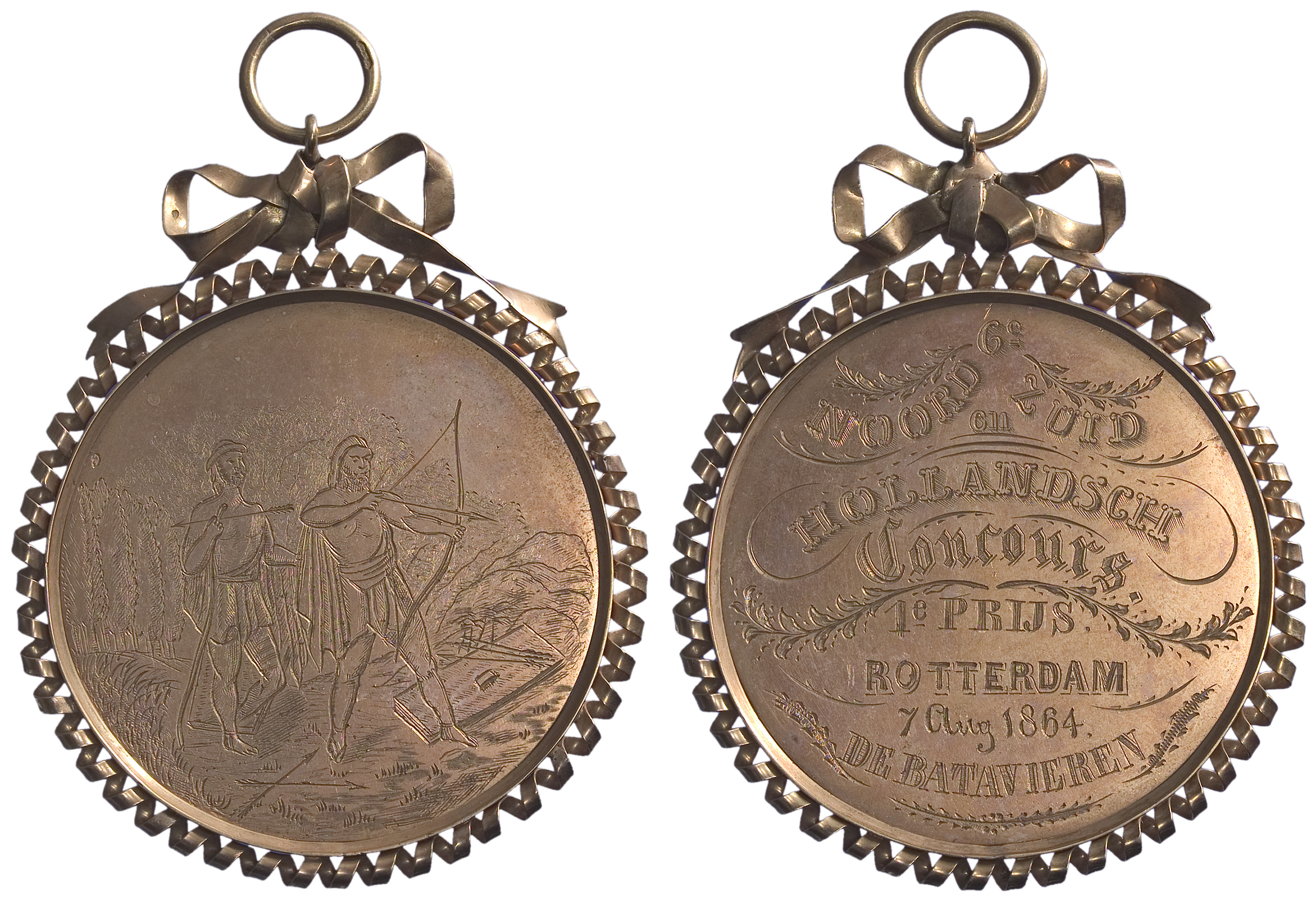 opschrift keerzijde: 6e NOORD en ZUID / HOLLANDSCH / CONCOURS / 1E PRIJS / ROTTERDAM / 7 Aug1864 / DE BATAVIEREN