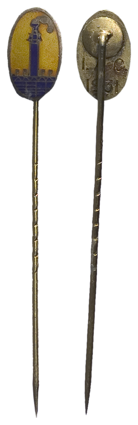 voorzijde: gezicht op het bevlagde stadion in Amsterdam, hetb vuur brandend op de Marathontoren, geëmailleerd. keerzijde: een bevestigingsspeld en een opschrift.- Trefwoorden