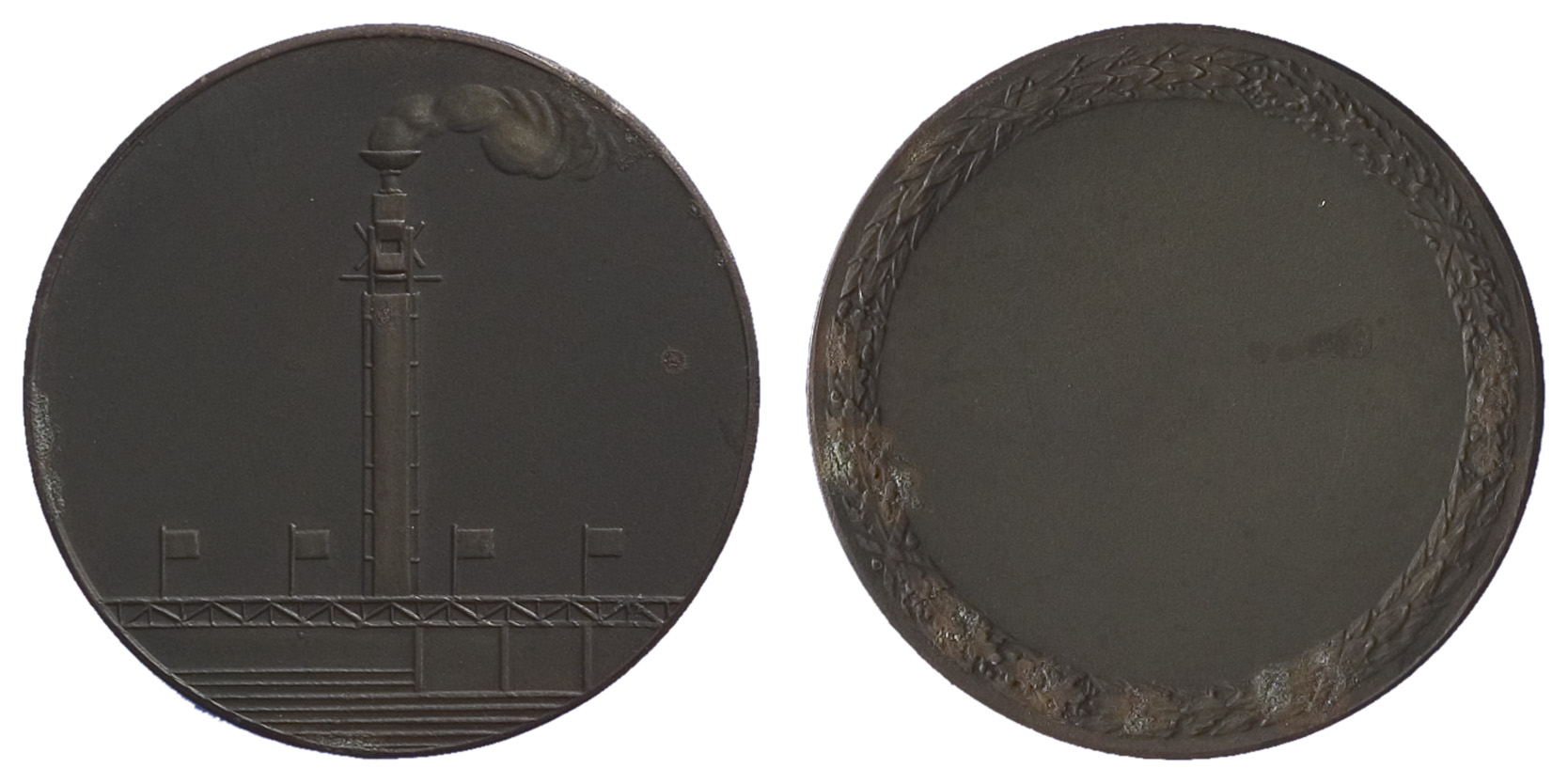 voorzijde: gezicht op het bevlagde Olympisch Stadion te Amsterdam met de Maratontoren en brandende schaal. keerzijde: een krans van eikenloof- lauwertakken.- Trefwoorden