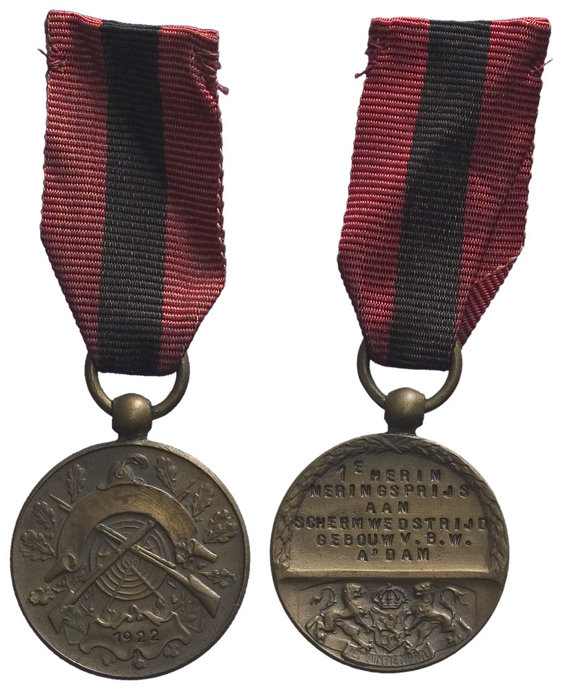 opschrift keerzijde: 1e HERIN- / NERINGSPRIJS / AAN / SCHERMWEDSTRIJD / GEBOUW V.B.W. / A'DAM