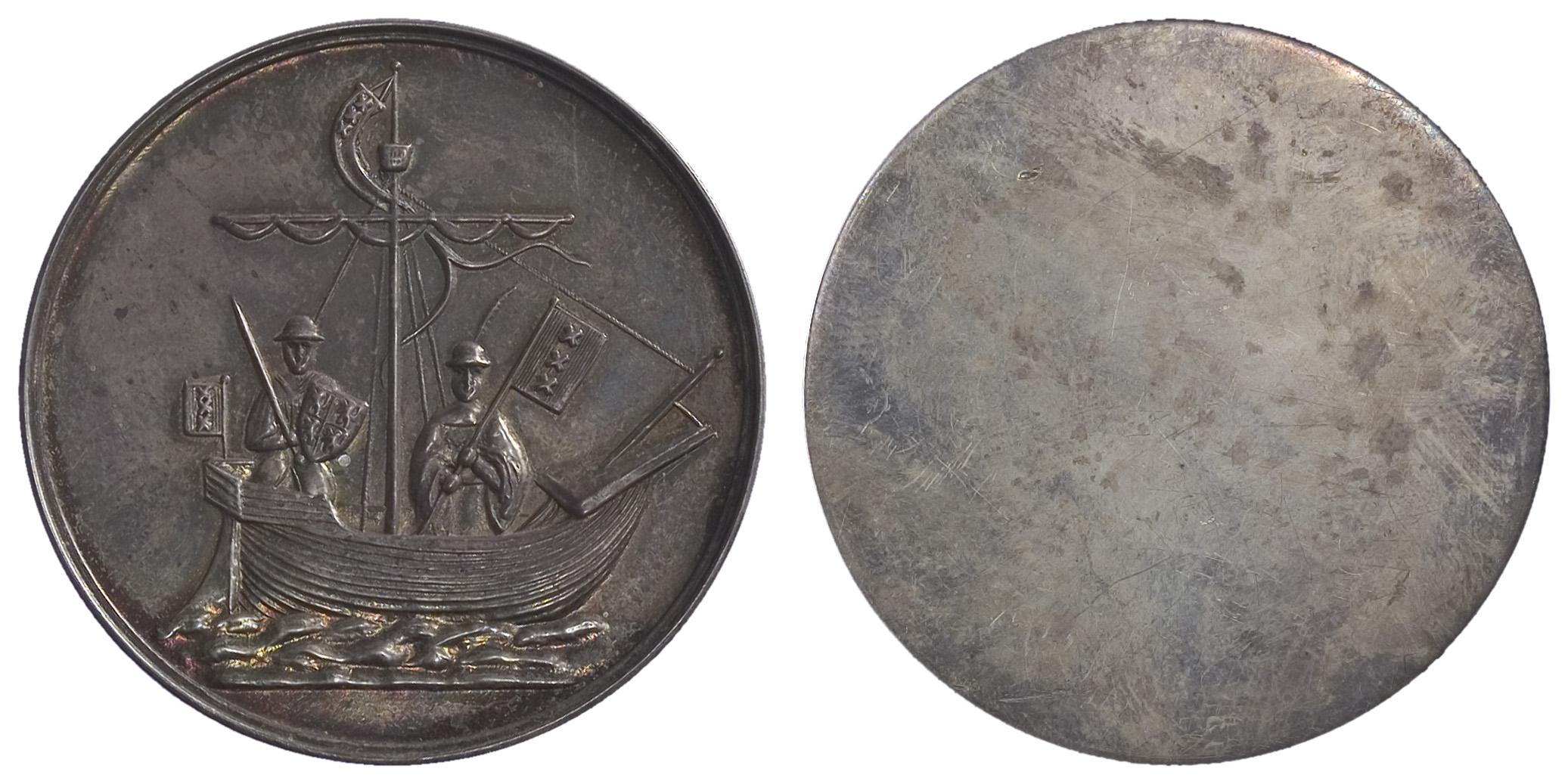 voorzijde: een koggeschip uit het oude stadswapen van Amsterdam, met twee figuren en face. Twee vlaggen waarop drie kruisen. In de afsnede een leeg veld. keerzijde onbewerkt.- Trefwoorden