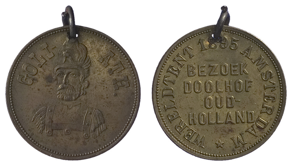 keerzijde: parelrand met omschrift en jaartal 1895. In het centrum een opschrift. Bovenaan doorboord en voorzien van een ring.