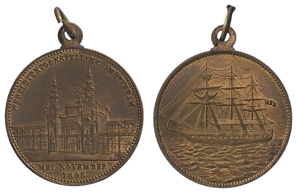 voorzijde: in een parelrand een omschrift, waarbinnen de entree van het tentoonstellingsgebouw van de wereldtentoonstelling te Amsterdam. In de afsnede een datum. Bovenaan een oog met ring.