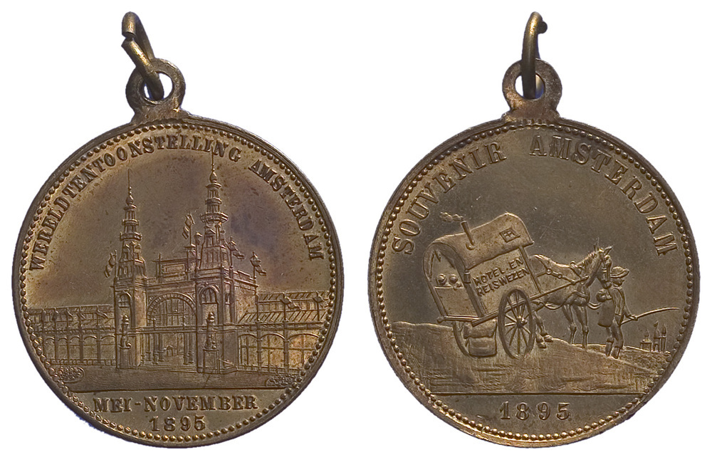 In 1895 vond in Amsterdam de Wereldtentoonstelling over het internationale hotel- en reiswezen plaats. Blikvanger waren een grote papier maché olifant en een reuzenkoffer. Het toerisme ontwikkelde zich in de tweede helft van de 19de eeuw tot een bloeiende bedrijfstak. Reisbureaus verschenen. Deze draagpenning was een souvenir van de Wereldtentoonstelling. ( Annemarie den Dekker)