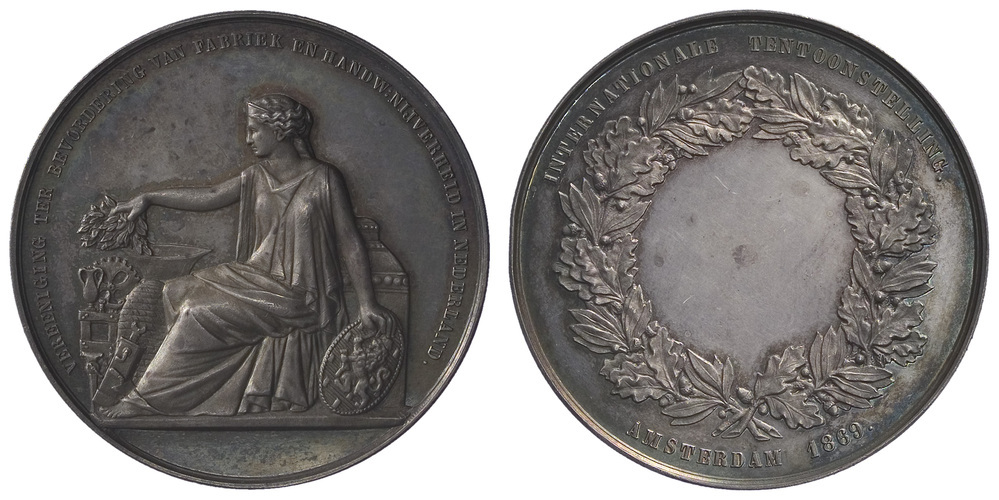 1869, fabriek-en handwerksnijverheid, internationale tentoonstelling te Amsterdam 1869, prijspenning der ver. ter bevordering van fabriek en handwerknijverheid, 1869