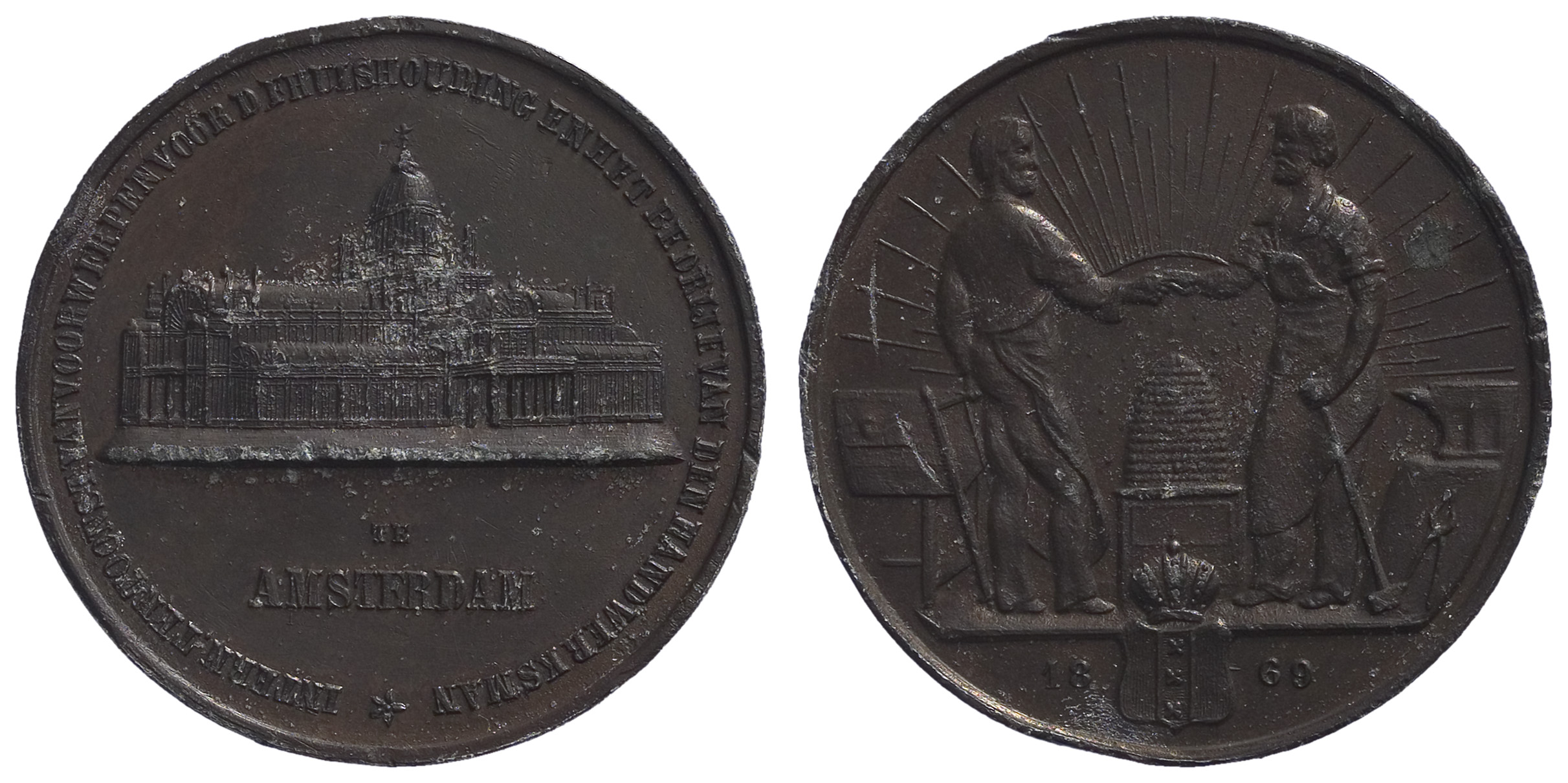 keerzijde: twee handwerklieden die elkaar de hand geven boven een bijenkorf; links een houtbewerker / timmerman en rechts een smid, op de achtergrond een zon met stralen. In de afsnede een gekroond wapen van Amsterdam, met een jaartal.