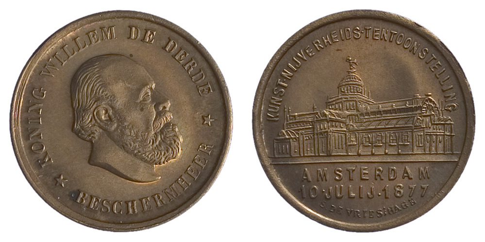 keerzijde: een afbeelding van het Paleis voor Volksvlijt te Amsterdam met een omschrift en een opschrift in de afsnede.
