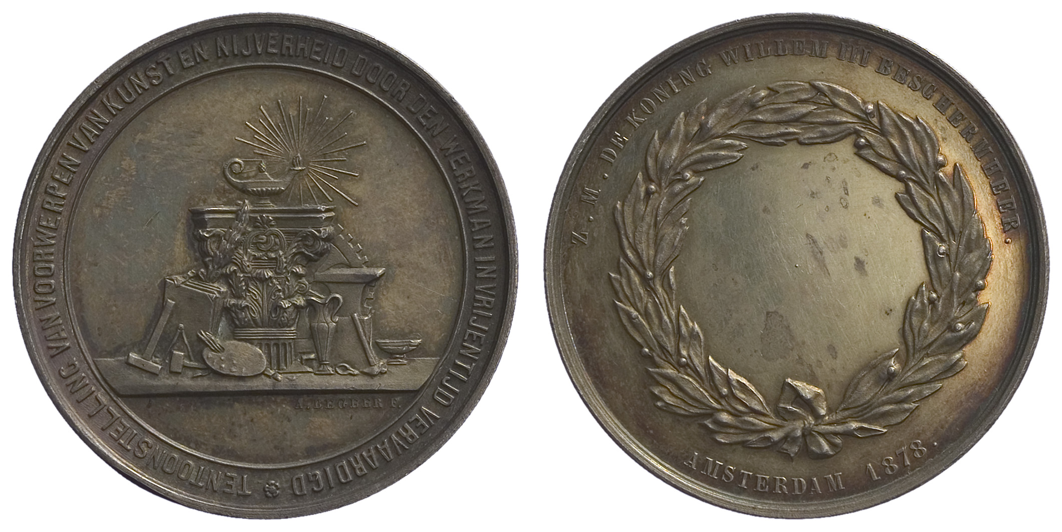 omschrift keerzijde: Z.M.DE KONING WILLEM III BESCHERMHEER. / AMSTERDAM 1878.