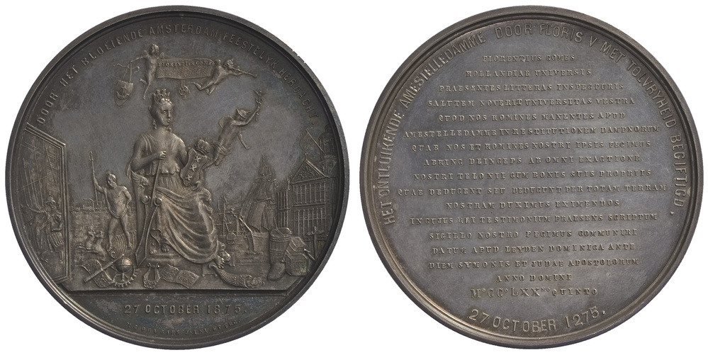 omschrift keerzijde: HET ONTLUIKENDE AMESTELLEDAMME DOOR FLORIS V MET TOLVRYHEID BEGIFTIGD . / 27 OCTOBER 1275 . /