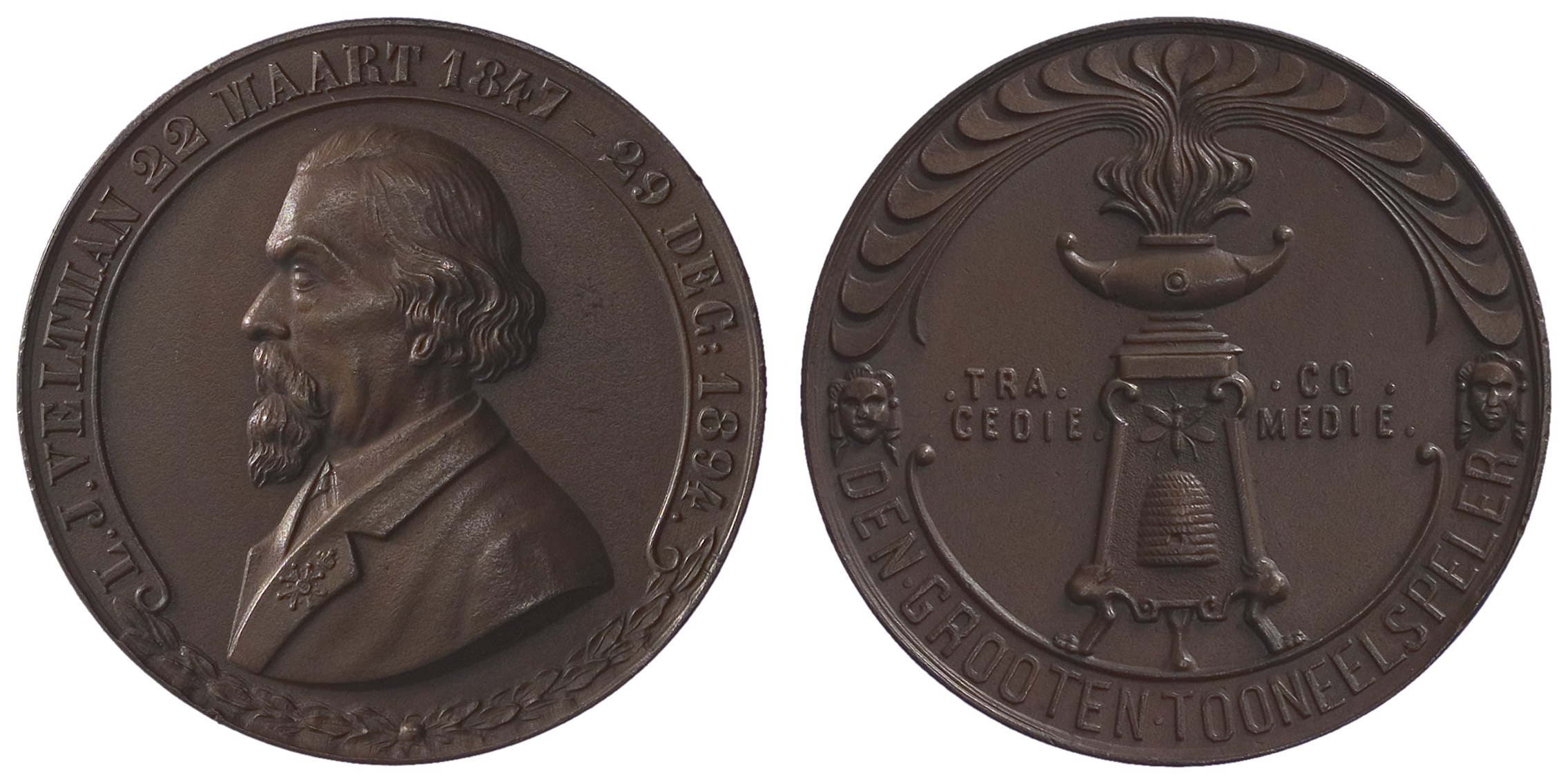 voorzijde: in een omschrift het naar links gewende borstbeeld van Louis Jacques Veltman (1817-1907). Onderaan een gestrikte lauwertak.