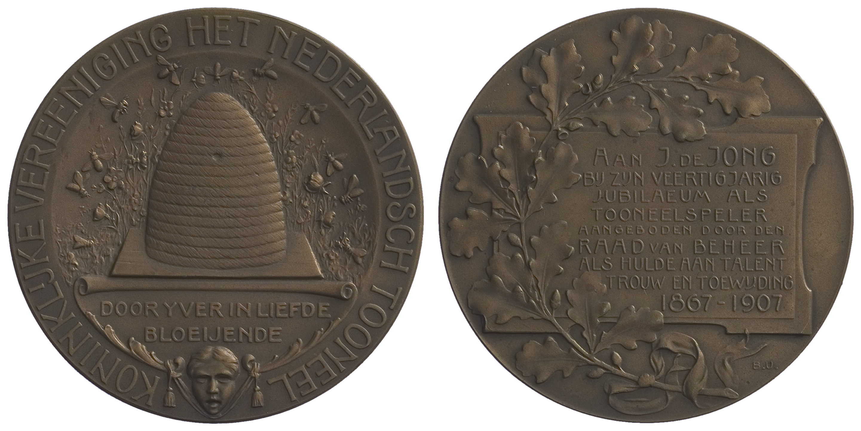 opschrift: AAN J. DE JONG / BIJ ZIJN 40 JARIG / JUBILAEUM ALS / TONEELSPELER / AANGEBODEN DOOR DEN / RAAD VAN BEHEER / ALS HULDE AAN TALENT / TROUW EN TOEWIJDING / 1867 - 1907