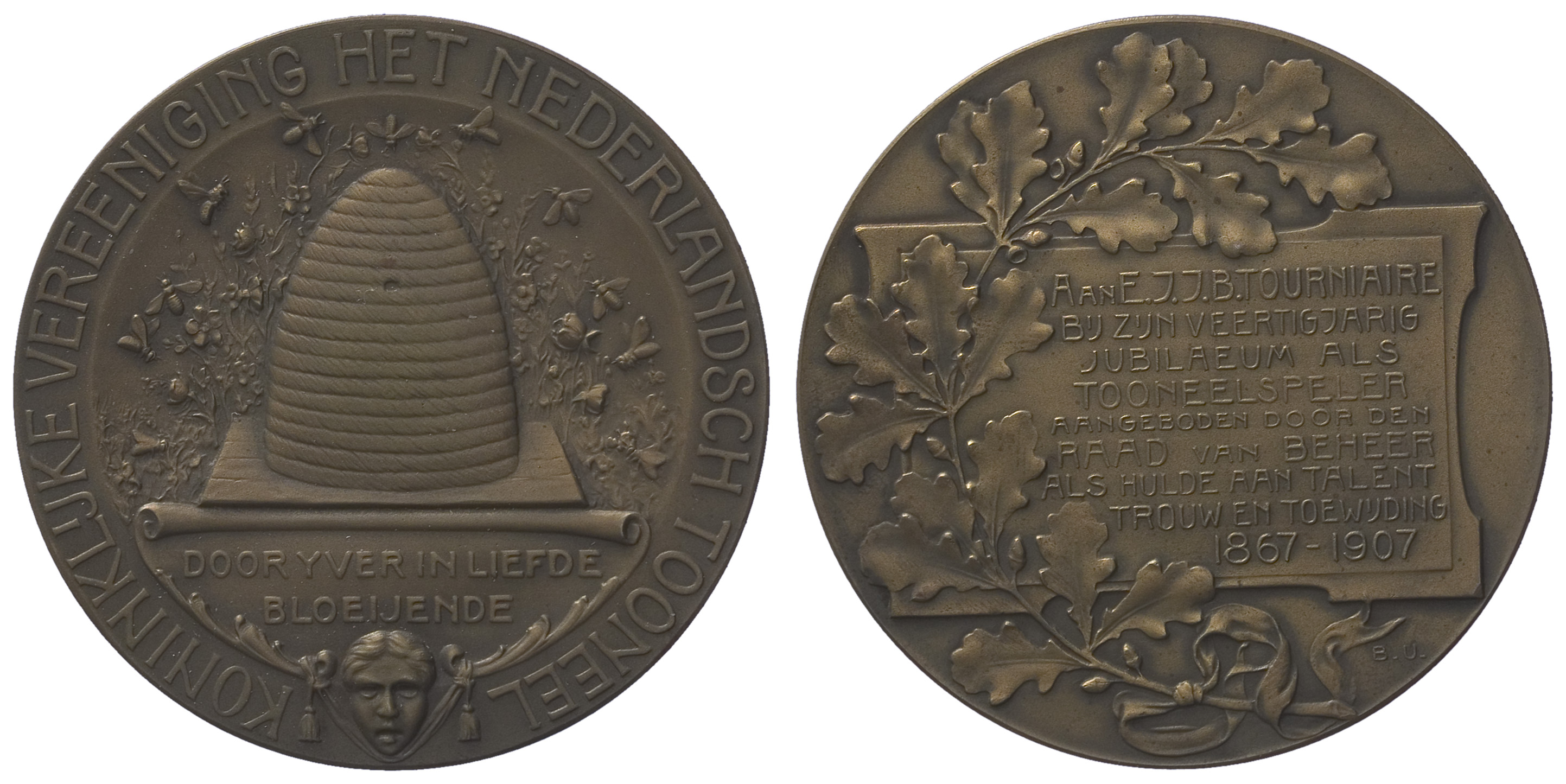 opschrift: AAN E.J.J.B. TOURNIAIRE / BIJ ZIJN 40 JARIG / JUBILAEUM ALS / TONEELSPELER / AANGEBODEN DOOR DEN / RAAD VAN BEHEER / ALS HULDE AAN TALENT / TROUW EN TOEWIJDING / 1867-1907