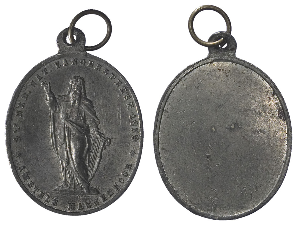 - omschrift voorzijde: 9e NED. NAT. ZANGERSFEEST 1869 * AMSTERDAMS MANNENKOOR *